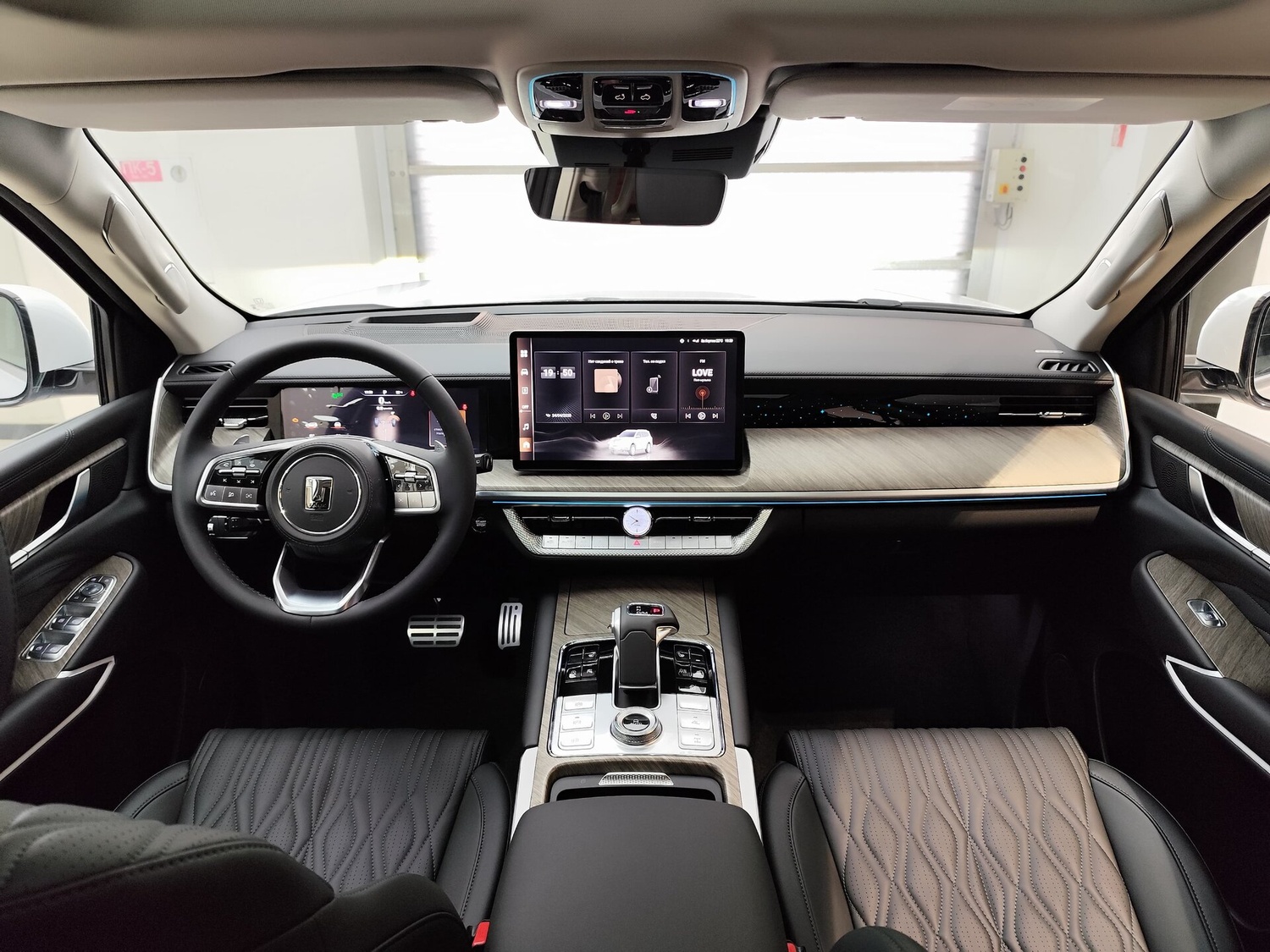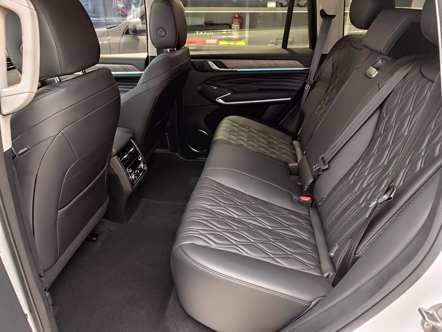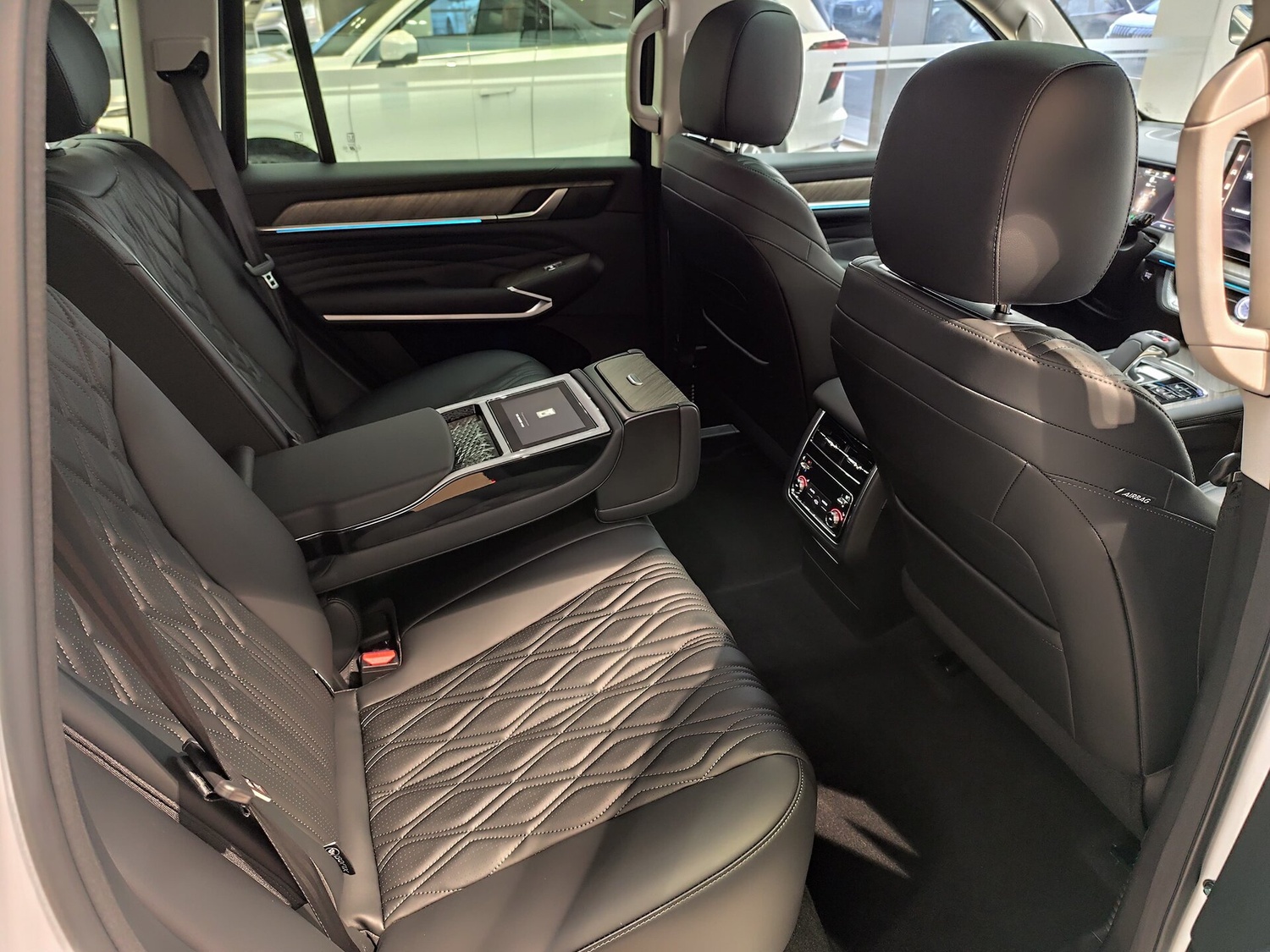 - Центральный подлокотник сидений заднего ряда с подстаканниками,отсеком для хранения и сенсорным экраном управления функциями автомобиля