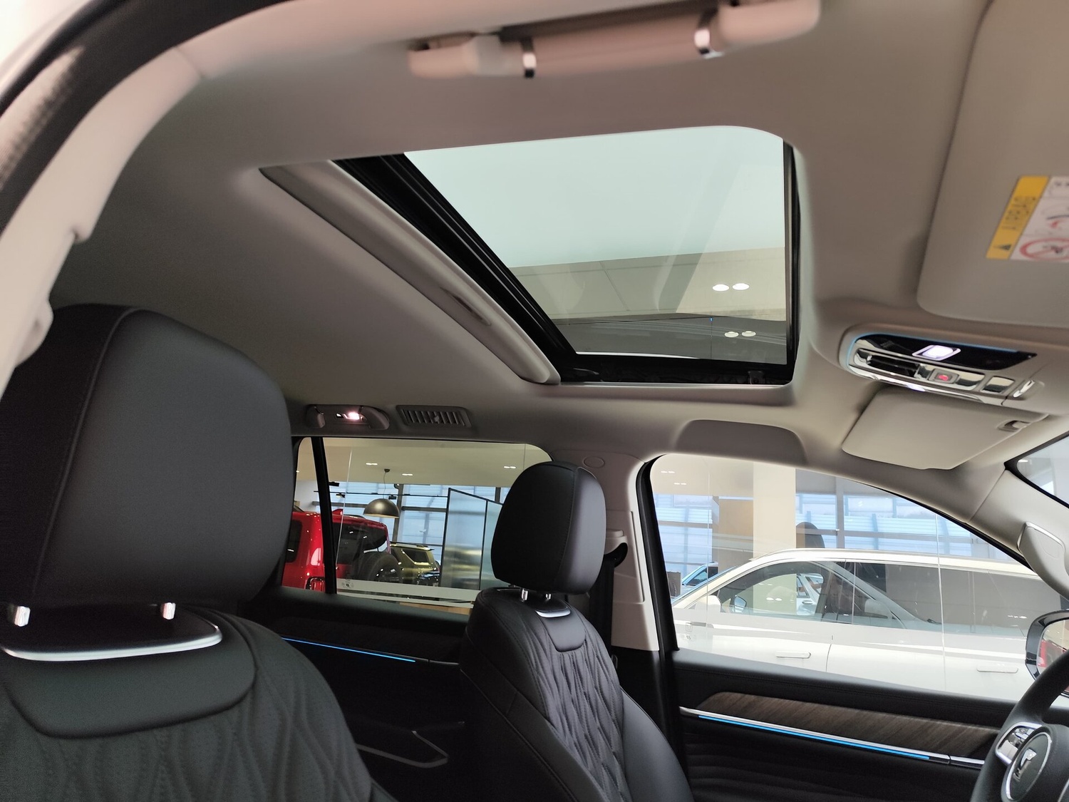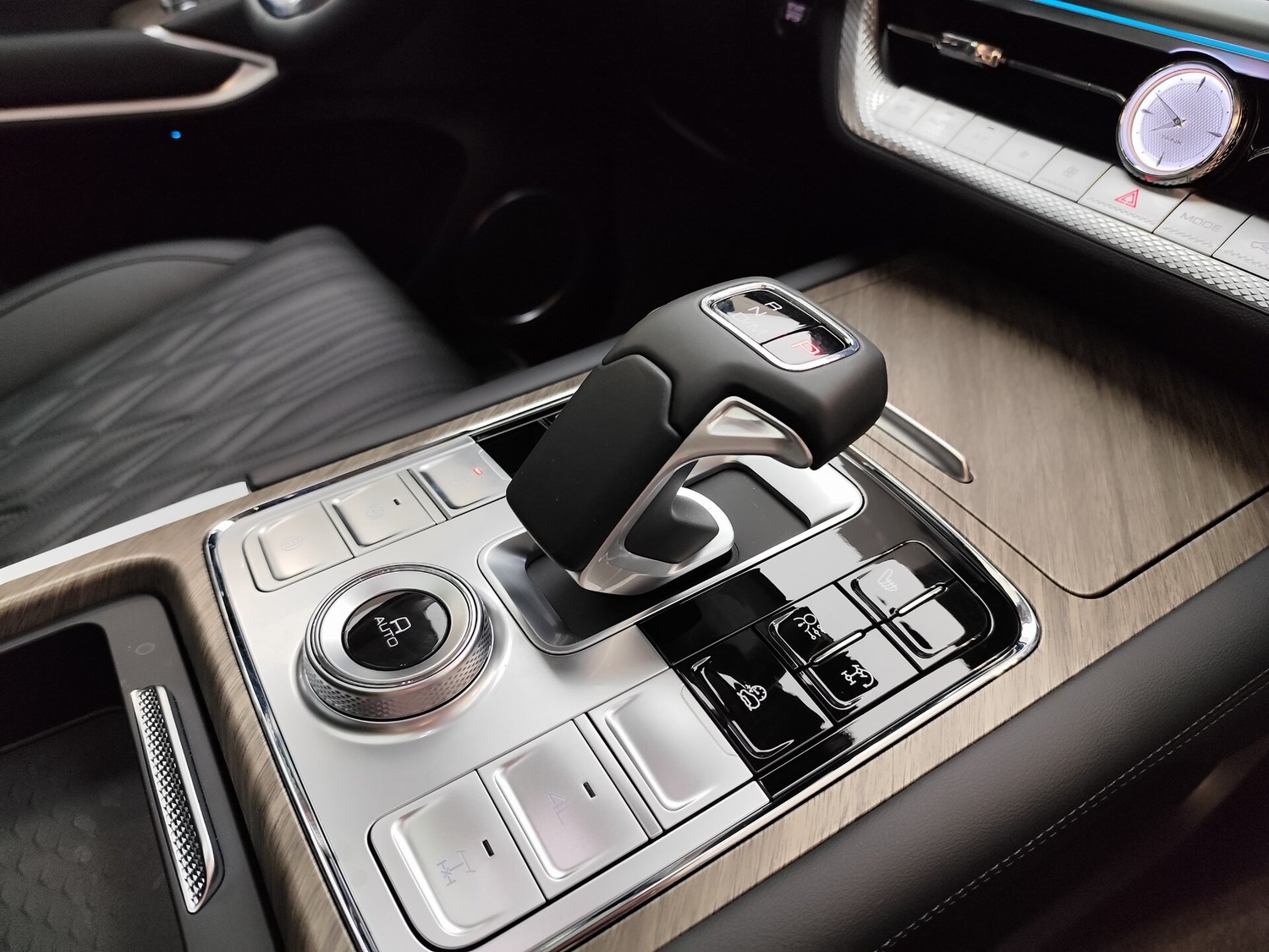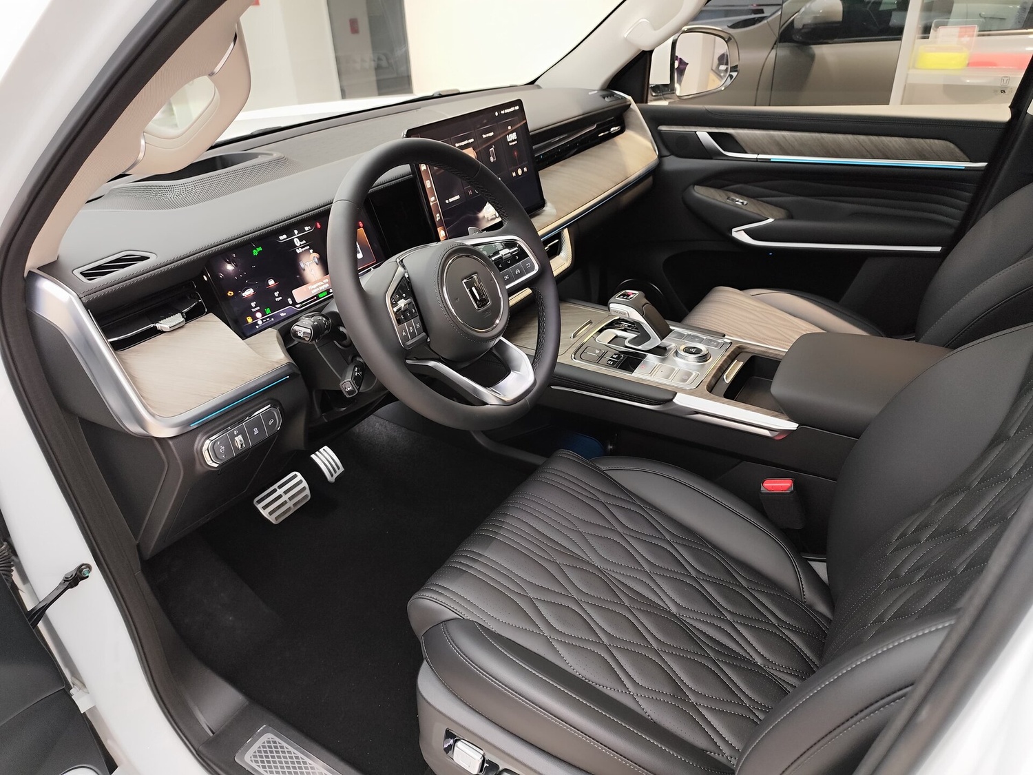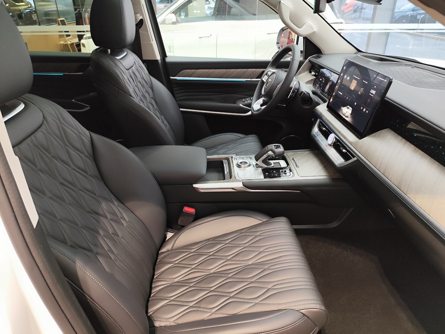 - Центральный подлокотник сидений заднего ряда с подстаканниками,отсеком для хранения и сенсорным экраном управления функциями автомобиля
