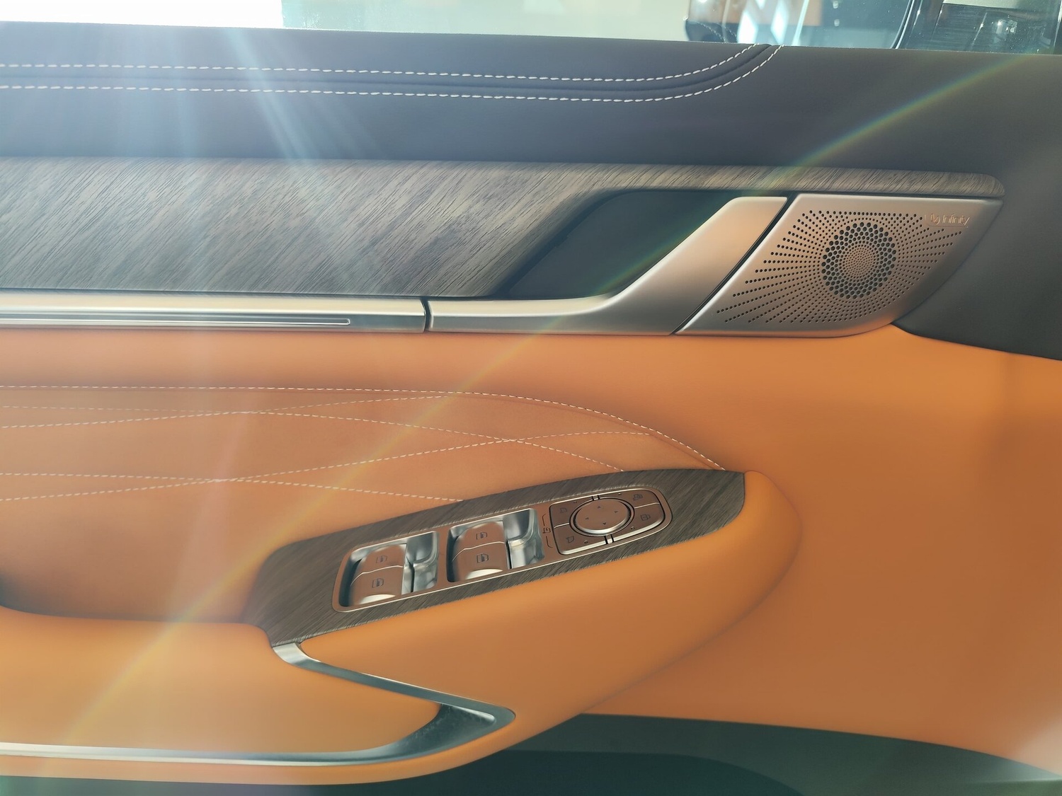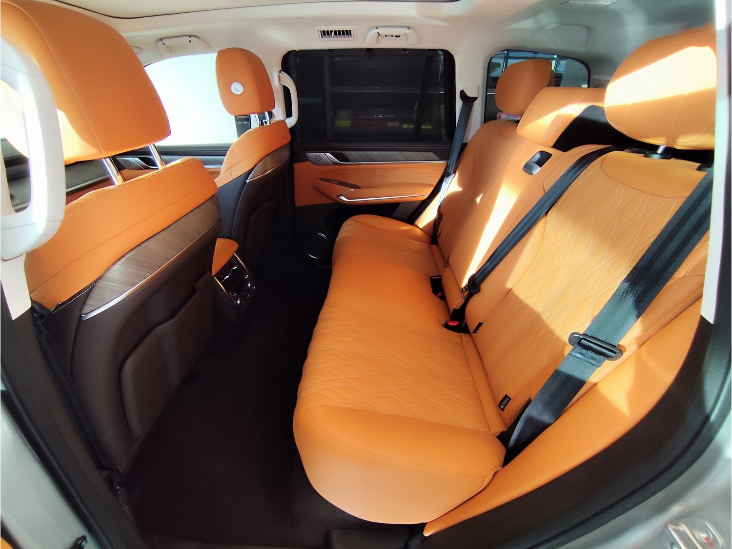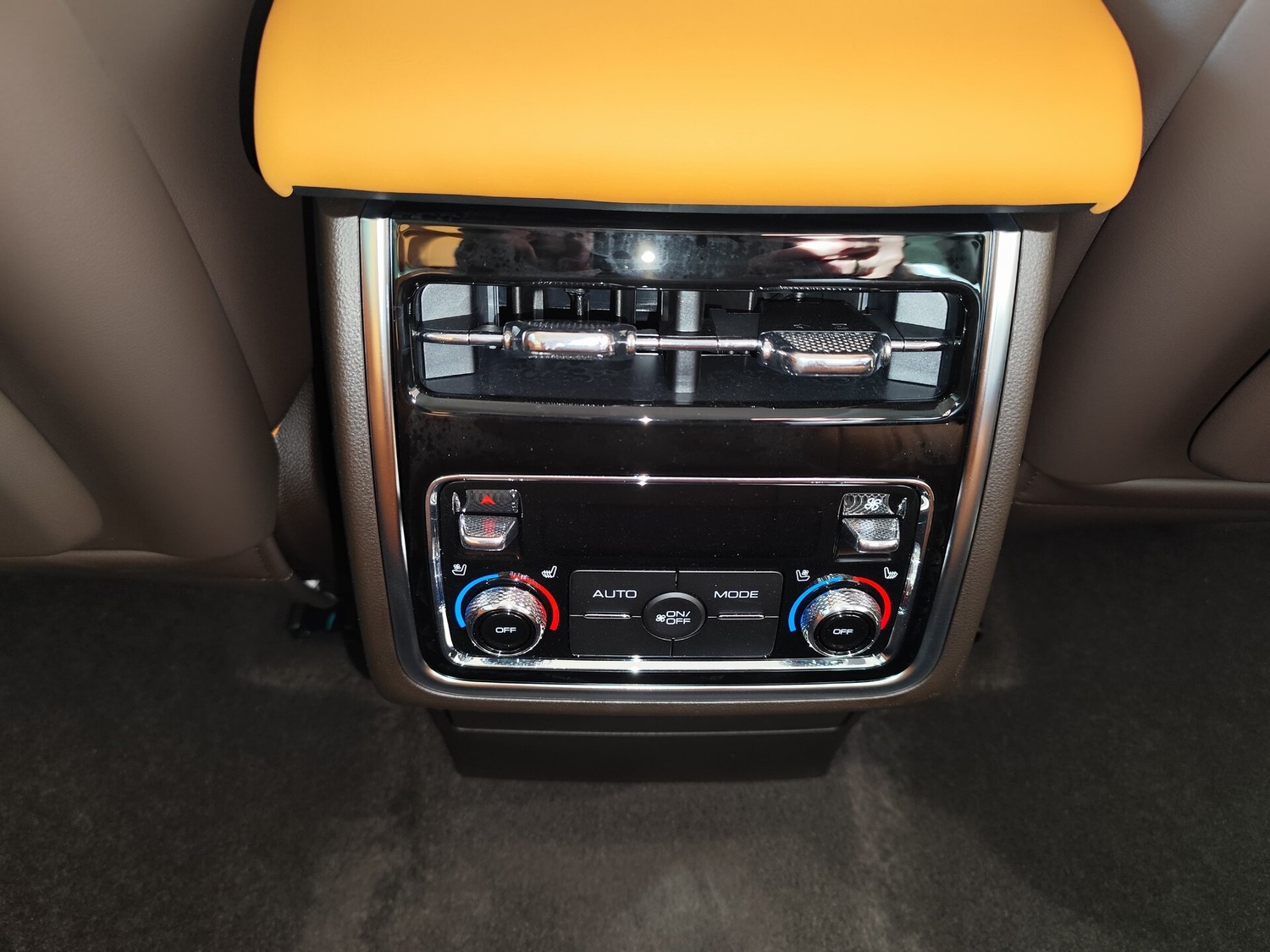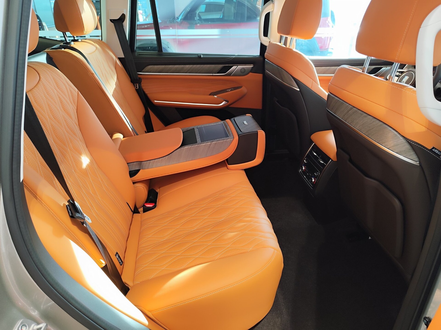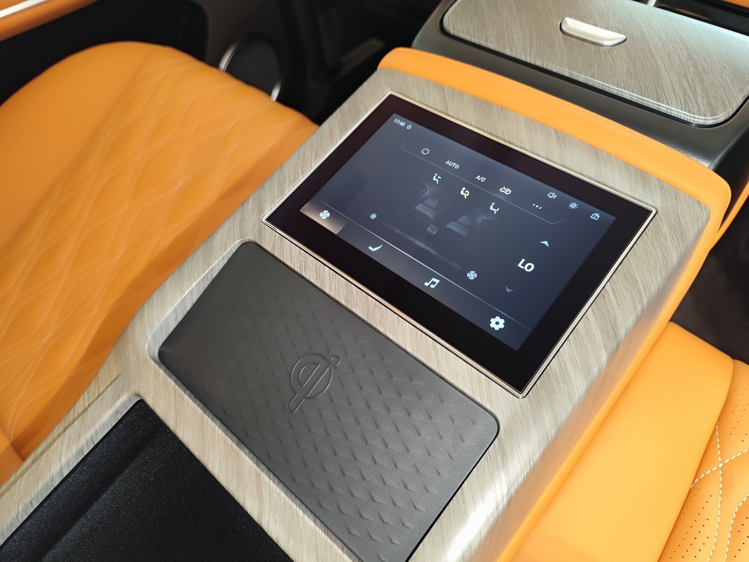 - Центральный подлокотник сидений заднего ряда с подстаканниками,отсеком для хранения и сенсорным экраном управления функциями автомобиля